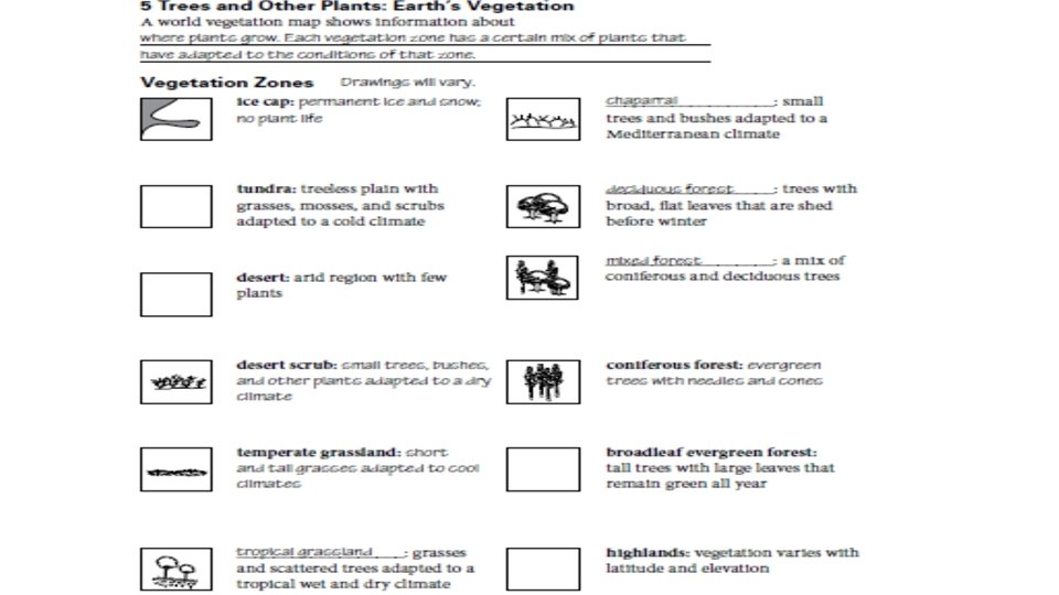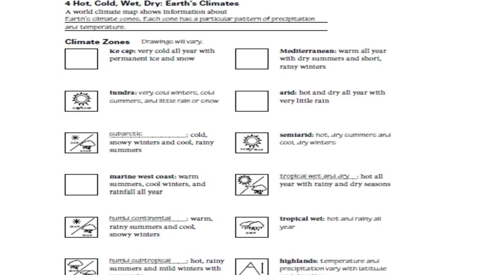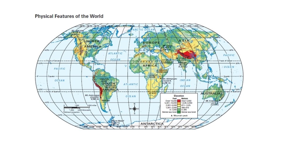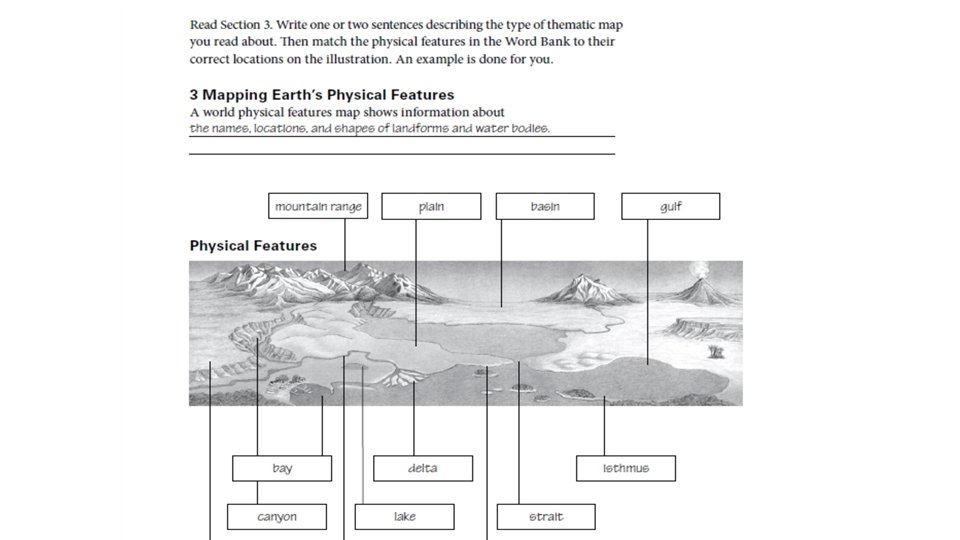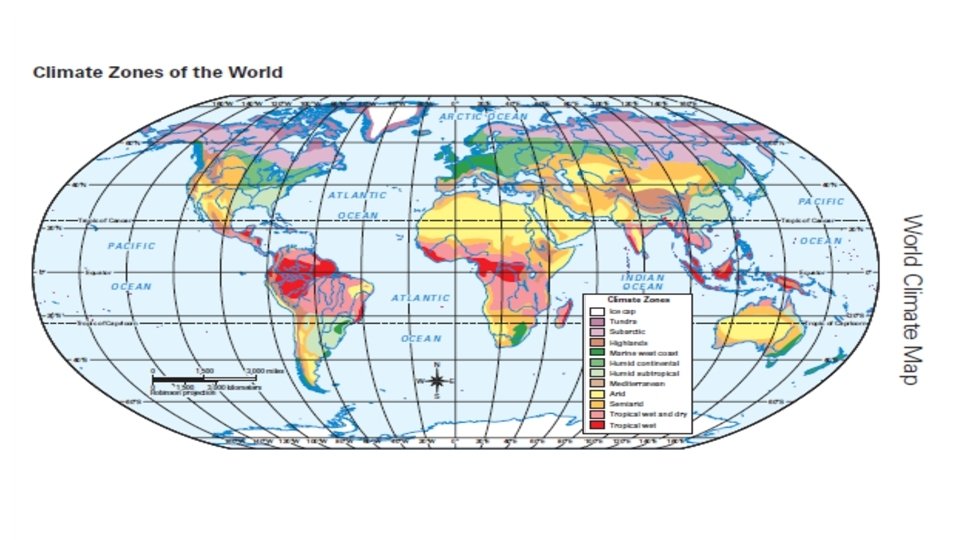 Agenda Thursday 9/8/16 • TEKS: (4) Geography. The student understands the factors that influence the locations and characteristics of locations of various contemporary societies on maps and globes and uses latitude and longitude to determine absolute locations. The student is expected to: • (D) identify and locate major physical and human geographic features such as landforms, water bodies, and urban centers of various places and regions; Supporting Standard • Language Objective: Students will understand how latitude, climate and elevation affect vegetation growth and population density. • Warm up: What water feature is used for transportation, agriculture and daily life? • Check Geoterms (Pages 2 & 3) • Read Sections 3 & 4 – A Spatial Way of Thinking • Earth’s Physical Features • Earth’s Climates (Hot, Cold, Wet, Dry) • Complete Pages 4 & 5 • HW: Test Thursday Sept 16 th