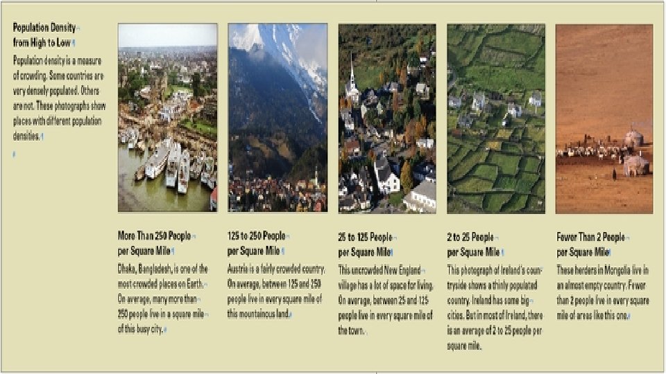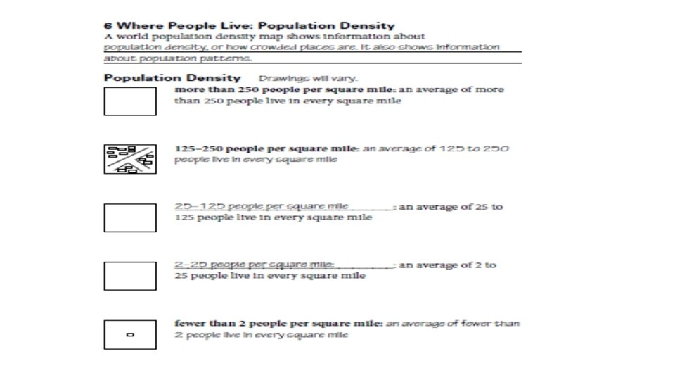 Agenda Friday 9/9/16 • TEKS: (4) Geography. The student understands the factors that influence the locations and characteristics of locations of various contemporary societies on maps and globes and uses latitude and longitude to determine absolute locations. The student is expected to: • (D) identify and locate major physical and human geographic features such as landforms, water bodies, and urban centers of various places and regions; Supporting Standard • Language Objective: Students will understand how natural resources affect a region’s economic activity and population patterns. • Read Sections 5 & 6 • Earth’s Vegetation • Population Density • A Spatial Way of Thinking – Complete Sections 5 & 6 • HW: Test Friday Sept 16 th