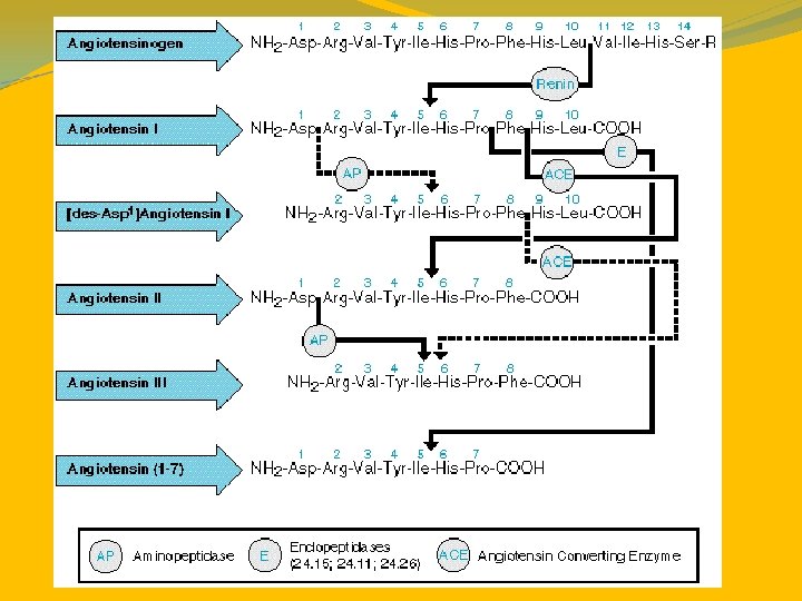The precursor of angiotensin, angiotensinogen is a glycoprotein of molecular weight 58, 000 – 61, 000. 1. Renin, an aspartyl protease(MW 35, 000 -40, 000) cleaves Leu-Val bond from the aspartic acid end of the angiotensin polypeptide to release the decapeptide angiotensin I. 2. Cleavage of dipeptide(His-Leuminal) frm the carboxy terminal of angiotensin. I by ACE to form the octapeptide angiotensin. II , potent vasoconstrictor.