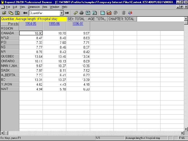 Another example This time the table consists of the average length of stay in hospital by sex, age, diagnostic chapter, region, and time period.