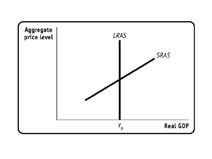 LRAS • If the price of output increased by 5% and nominal wages had enough time to increase by 5%, there would be no profit incentive to increase output. • All we would experience would be an increase in the Aggregate Price Level. • The LRAS is vertical • The LRAS touches the horizontal axis at the economy’s potential output, Yp: The level of real GDP the economy would produce if all prices, including nominal wages, were fully flexible.