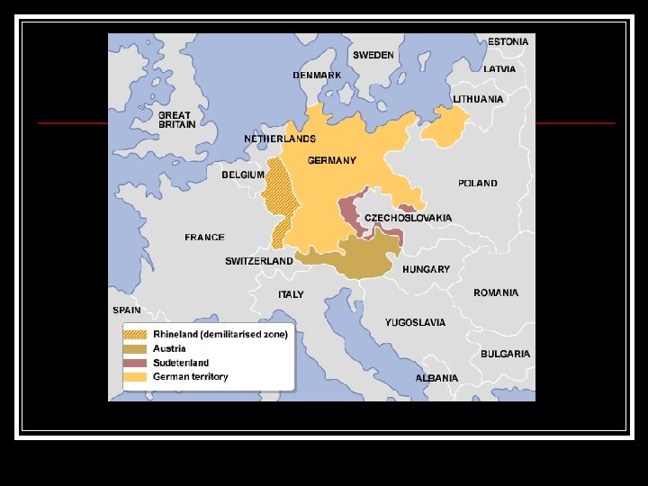 Germany n Hitler wanted to undo the Treaty of Versailles n n n Muss. and Hitler formed Rome-Berlin Axis. n n Expanded army Invaded Rhineland (area between France & Germany) Took Austria (Anschluss) Took Czechoslovakia (Sudetenland) Later added Japan to form Axis Powers Signed secret Nonaggression Pact (agreement to not attack) with Stalin