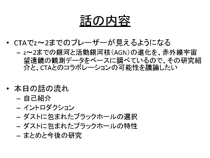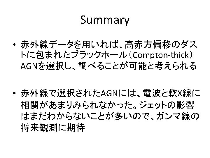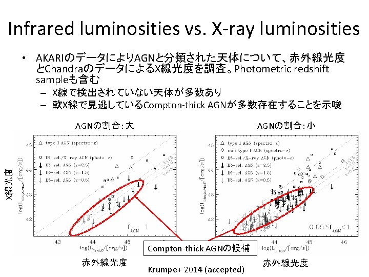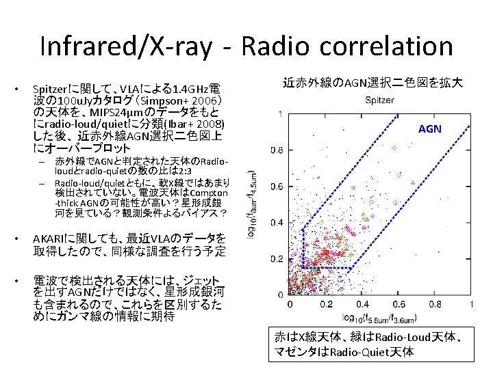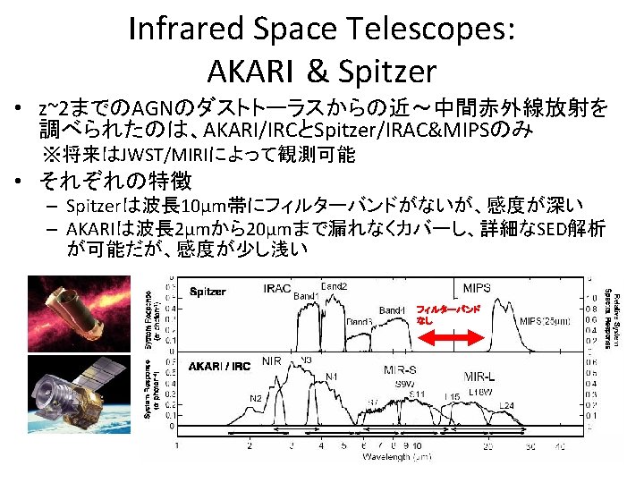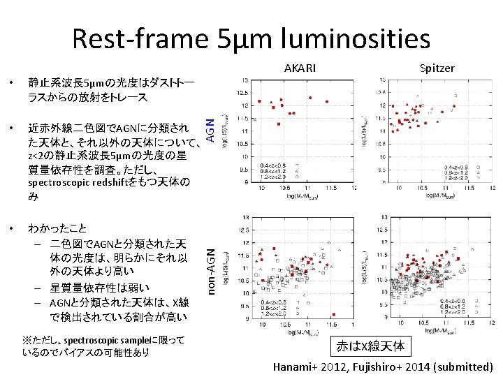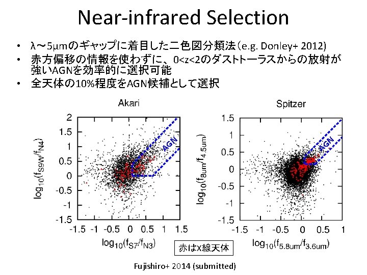 Mid-infrared Selection • AKARI/IRCのフィルターセット を活用した、PAH features, Si absorptionに着目した二色図 分類法 (e. g. Hanami+2012) • 赤方偏移の情報が必要。 Photometric redshiftを使用 する場合は、その精度が重 要 Hanami+ 2012