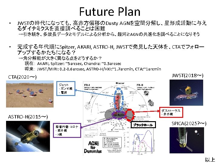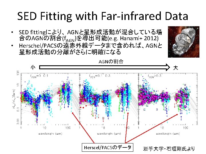 SEDs of AGN/star-forming galaxies from ultraviolet to mid-infrared wavelength 赤外線においては、AGNのダストトーラスからの放射だけでなく、 星生成活動が起源の放射もある →SEDに着目し両者を見分ける SWIRE Template Libraries (Polletta+ 2008) Dust torus PAH features Si absorption