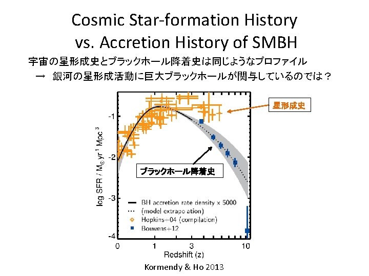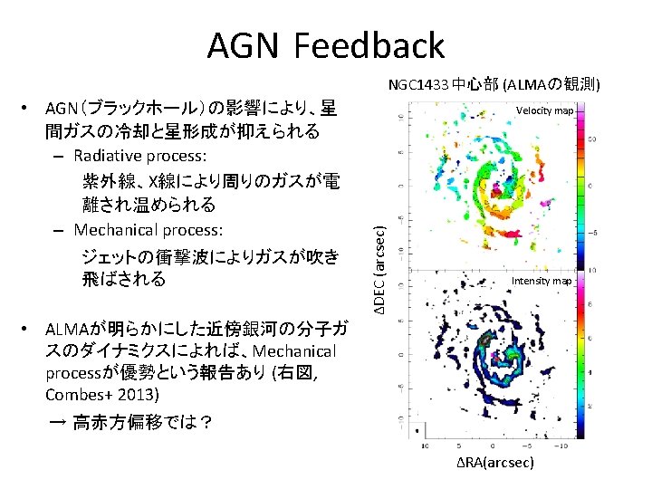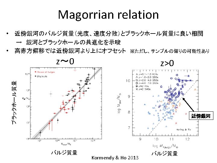 AGN Distribution on Color-Mass Diagram 星形成を終えた重い銀河(Red sequence)と星形成中の軽い銀河(Blue cloud) の中間付近(Green valley)にAGNが多く分布 → AGNは星形成の抑制に関与した? z~ 0 (SDSS, Galaxy Zoo project) (静止系) u-r カラー Red sequence Green valley Blue cloud 星質量 Schawinski 2012