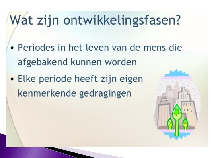 De ontwikkelingsfasen � Baby � Dreumes � Peuter � Kleuter � Jonge schoolkind � Oude schoolkind � Puber � Adolescent � Volwassene � Opdracht: zet de leeftijden bij elke fase.