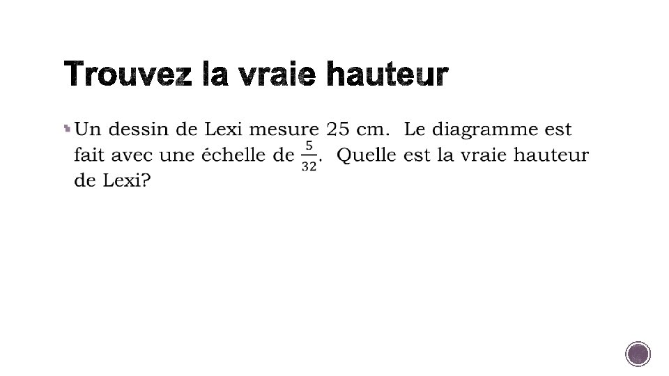 § Mon chien à une longueur de 64 cm. Dans une photo que j’ai pris sa longueur est de 5, 2 cm. Quel est le facteur échelle?