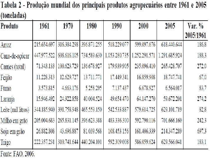0 10. 000 a. C. 1900 1400 1800 1950 2000 Aprimoramento da tecnologia Agro química, máquinas e implementos 1959 – Primeira fábrica de tratores no Brasil – CBT Desenvolvimento do sistema de produção em escala Surgimento de grandes agroindústrias 1950