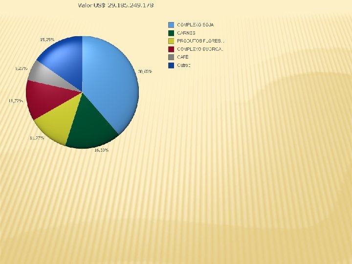 Principais Produtos Exportados 2004 AÇÚCAR DE CANA EM BRUTO 4% CARNE DE FRANGO in natura 6% SOJA EM GRÃOS 14% FARELO DE SOJA 8% MILHO 1% DEMAIS 43% CARNE BOVINA in natura CELULOSE 5% 4% SUCOS DE LARANJA 3% FUMO NÃO MANUFATURADO 3% CAFÉ VERDE 4% AÇÚCAR REFINADO 3% Fonte: Agro. Stat Brasil a partir de dados da SECEX / MDIC Elaboração: CGOE / DPI / SRI / MAPA