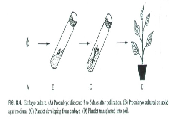 Embryo Culture • Embryo culture developed from the need to rescue embryos (embryo rescue) from wide crosses where fertilization occurred, but embryo development did not occur • These techniques have been further developed for the production of plants from embryos developed by non-sexual methods (haploid production discussed later)