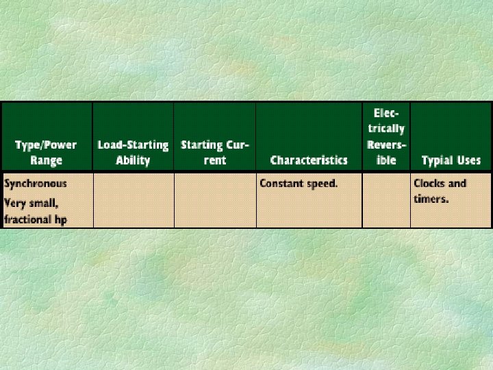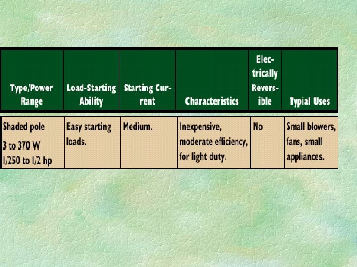 Shaded-pole motors § Are constructed simply, are low cost, and have low starting torque. § They are not electrically reversible and have low efficiencies. § They are used for small, light loads such as small fans.