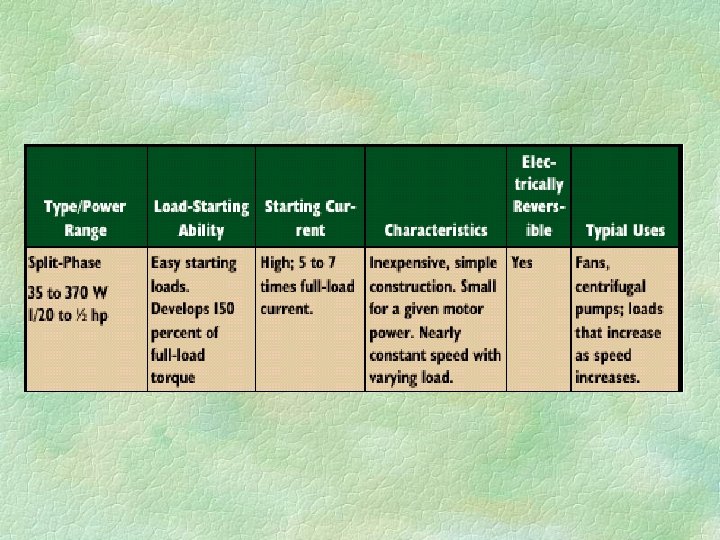 Split-phase motors § Are simple in construction and relatively low in cost. § Have a low starting torque and require a high starting current. § Are limited for use on loads that are easy to start.