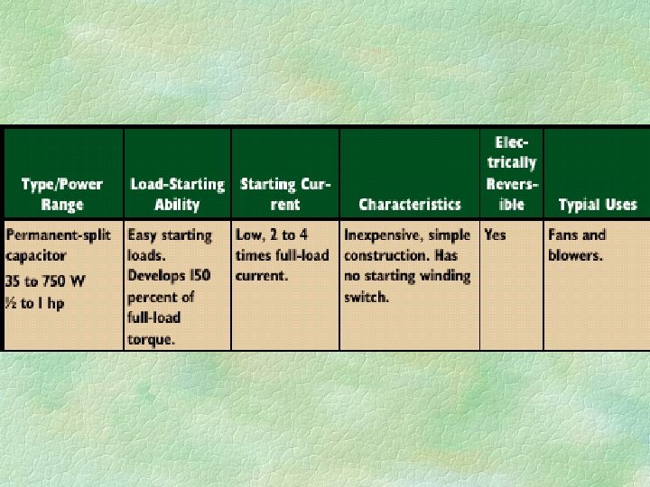 Permanent-split capacitor motors § Use the same value of capacitance in both starting and running windings. § They have very low starting torque and no starting mechanism.