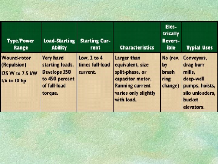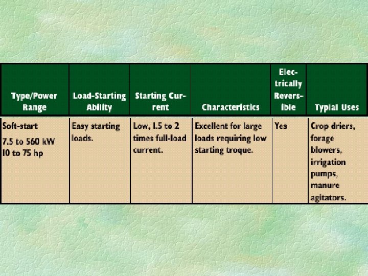 Soft-start motors § May be useful for applications requiring large motors, but needing only a very low starting torque. § These are single-phase motors, but if three-phase power is available, it is best to use a three-phase motor.