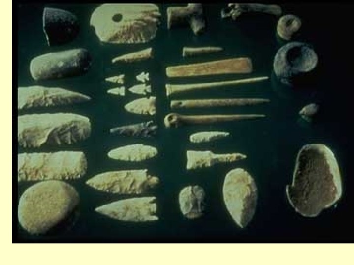 The Technology of Paleolithic Societies • Early tools - wood, bones, animal skins, and stone, • Tools provided shelter, protection, clothing and food. • Tools used to build tents, huts, wooden and stone structures. • Fire for light and warmth • First weapons included rocks and clubs, knives, spears, axes, and the bow and arrow. • Mats and baskets were used to carry nuts, berries, and plants.