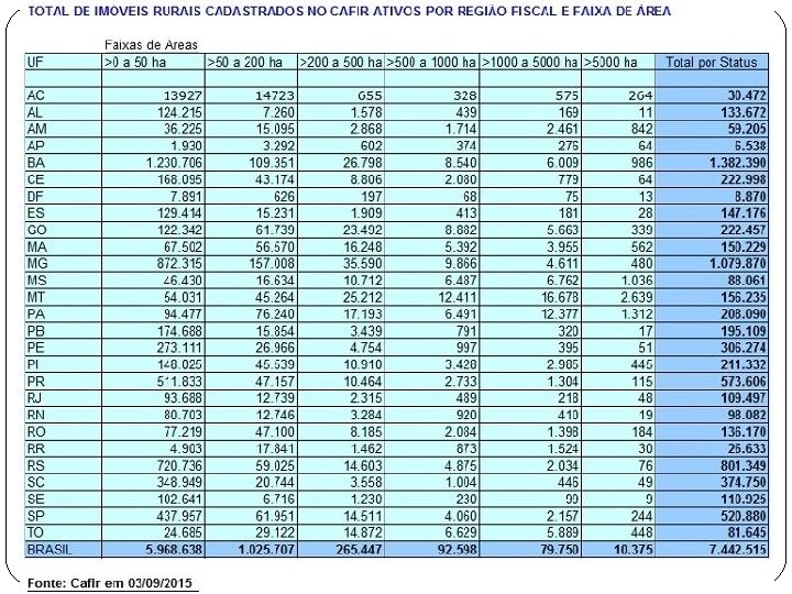CAFIR - Relatório de Imóveis Rurais por Município Nov/2017 � Quantitativo de Imóveis rurais por Estado e por Município, nas situações cadastrais ativa, pendente e cancelada. � O Brasil possui, atualmente, cadastrados no Cafir, até 30/11/2017, �aproximadamente 7. 779. 672 imóveis rurais na situação cadastral ativa, � 4. 481 na situação cadastral pendente �e 1. 200. 362 imóveis na situação cadastral cancelada, �Total de 8. 984. 515 registros. � Neste relatório - verificar informações de cadastro de imóveis rurais de todos os municípios brasileiros, por faixas de áreas e por situação cadastral. � Clique aqui para acessar o relatório.
