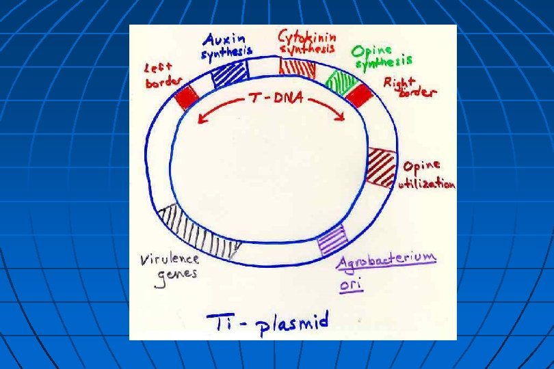 Agrobacterium tumefaciens n Characteristics • Plant parasite that causes Crown Gall Disease • Encodes a large (~250 kbp) plasmid called Tumorinducing (Ti) plasmid n Portion of the Ti plasmid is transferred between bacterial cells and plant cells T-DNA (Tumor DNA)