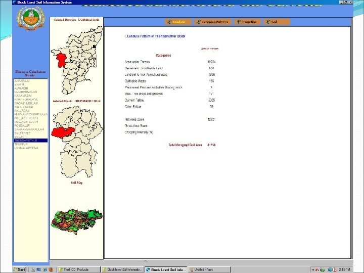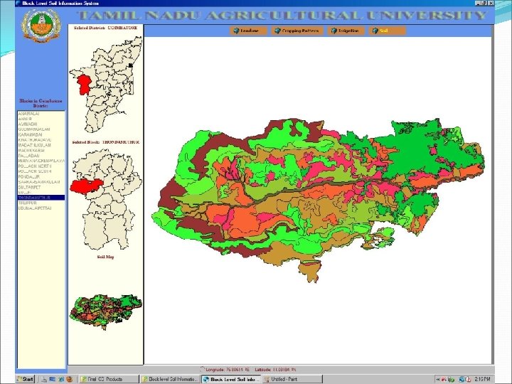 RS & GIS Applications in Agriculture SOIL RESOURCE INVENTORY �Visual interpretation of FCC from TM & LISS and PAN sharpened LISS 3 data �Digital classification of LISS 3 data and integration of Physiography, Results of Terrain Analysis of DEM �Selection of sample strips and profile examination and laboratory analysis �Digital Soil Database for Tamil Nadu in NRIS of ISRO �Land Evaluation and Management Options and Crop Selection
