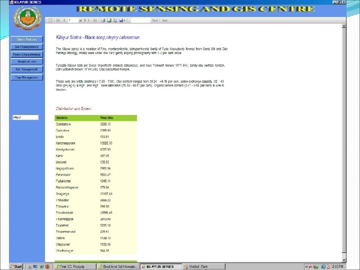 Introduction of RS & GIS �RS Applications in Agriculture – a Unit in SS&AC Dept. started in 1989 �Soil Scientists trained in National and International Institutions �Used visual products for mapping Soil Resources �Delineated gypsum mined areas, water logged areas �Modeled soil erosion by water �Carried out varietal discrimination, biomass and yield estimation in field crops � Generated DTM of micro-watershed