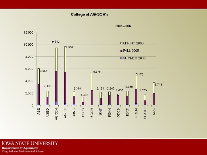 Agronomy at Iowa State University: The Potential • ISU Agronomy graduates have a 100% placement rate • Iowa State Agronomy Alumni go on to: – – – – Coordinate plant breeding programs Assist in biotechnology labs Educate about soil and water conservation practices Manage farms Develop renewable sources of energy Sell farm inputs Make policy about global food systems Applying science to fuel and feed our global society