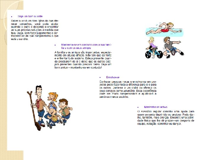 Há qualquer coisa que não está bem com alguém que conheço… Lista de pistas importantes a considerar: » deixou de falar com familiares ou amigos » perdeu a vontade e motivação para as actividades habituais » começou a ficar com medo(s) ou com desconfianças sem motivo » deixou de se alimentar ou come às escondidas » dorme mal ou não consegue dormir toda a noite » começou a ter ideias estranhas » ouve vozes que mais ninguém consegue ouvir » tem graves dificuldades de concentração » diz ou escreve coisas que não fazem sentido » abusa de álcool ou drogas