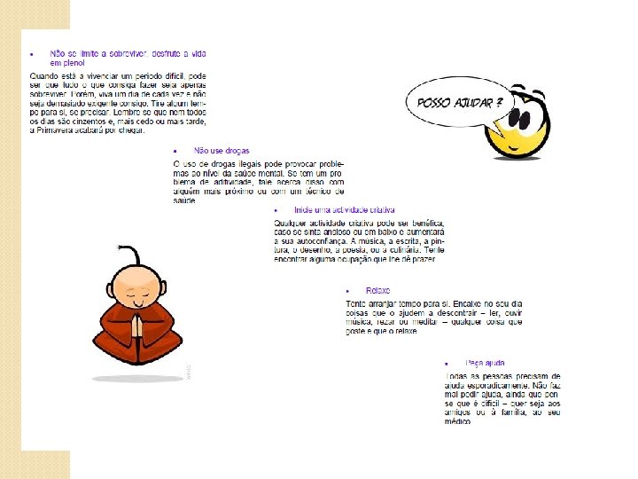 Como posso ajudar… » Incentivar a pessoa a procurar um médico/psicólogo » oferecer suporte, acompanhando a pessoa ao médico/psicólogo » se a pessoa recusa tratamento, procure o técnico para o aconselhar e orientar. Cuidar sim, discriminar não. Cada ser humano nasce e desenvolve-se de maneira única. Nenhuma pessoa é igual à outra, reconhecer isso é fundamental para compreender e respeitar os diferentes.