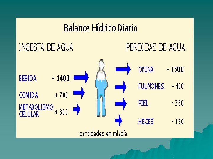 Es importante considerar que una característica de las células vivas es que son capaces de mantener constantes las propiedades y la composición química de estos líquidos celulares. El agua que circula en el organismo proviene de una ingesta externa por medio de la dieta y en menor proporción, es sintetizada en las reacciones metabólicas que ocurren entre las células. Por otro lado es expulsada al exterior a través de la orina, las lágrimas y el sudor.