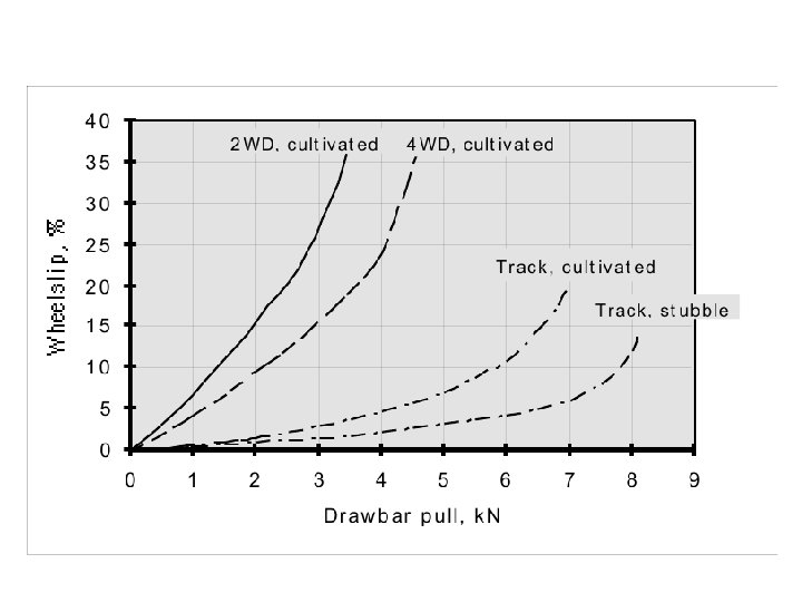 DRAWBAR PULL, P = H - R • (i) tracks compared to 2 WD on cultivated (loose) soil which shows the effect of area and length of contact patch and of weight • (ii) tracks on stubble (firm) compared to cultivated (loose) soil which shows the effect of soil strength and rigidity (deformation modulus) • (iii) 4 WD compared to 2 WD on cultivated (loose) soil which shows the effect of area and weight.