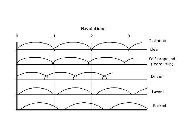 Operational states of a wheel a) Towed Wheel is towed with zero opposing external torque; the unknown parameter is the R. b) Self-propelled Wheel is driven by external input torque to overcome R and to propel with no drawbar pull. The unknown is R. c) Driven Wheel is driven by external input torque and to develop a drawbar pull. The unknown is i. Extreme case: no move. d) Braked Wheel is towed against an opposing, external torque. The unknown is i. Extreme case: wheel skids.