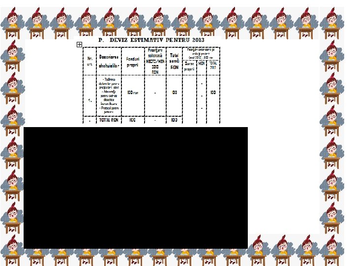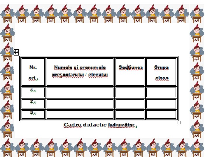 • • • • • • . Titlul activităţii: Imprimarea adeverinţelor, diplomelor şi expedierea lor participanţilor. b. Data/perioada de desfăşurare: iunie / iulie 2013 c. Responsabil: prof. învăţ. primar Costea Agnes – Sibiu , prof. Huştiuc Nicoletta – Alba d. Beneficiari: preşcolari, cadre didactice I. Rezultatele aşteptate Concursul se doreşte a fi un bun prilej de promovare a inovaţiei / creativităţii şi originalităţii demersului didactic. J. Modalitatea şi indicatorii de evaluare Prin numărul de participanţi ; Impactul în rândul preşcolarilor / elevilor, cadrelor didactice, părinţi, comunitate ; Expoziţie, fotografii, diplome K. Metode de evaluare observarea sistematică a comportamentului grupului – ţintă, jurnalul reflexiv, jocul de rol L. Instrumente de evaluare chestionarul de autoevaluare, chestionarul de satisfacţie, analiza SWOT, lista de control, studiul de caz, interviul, portofoliu, fişa de ( auto ) evaluare a proiectului, raport de evaluare M. Beneficiarii direcţi şi indirecţi Beneficiari direcţi: preşcolarii / elevii claselor Pregătitoare / I - VIII Beneficiari indirecţi: cadre didactice îndrumătoare din grădiniţe / şcoli participante la concurs, părinţi. N. Continuitatea / sustenabilitatea posibilitatea de dezvoltare / continuare ulterioară a proiectului prin