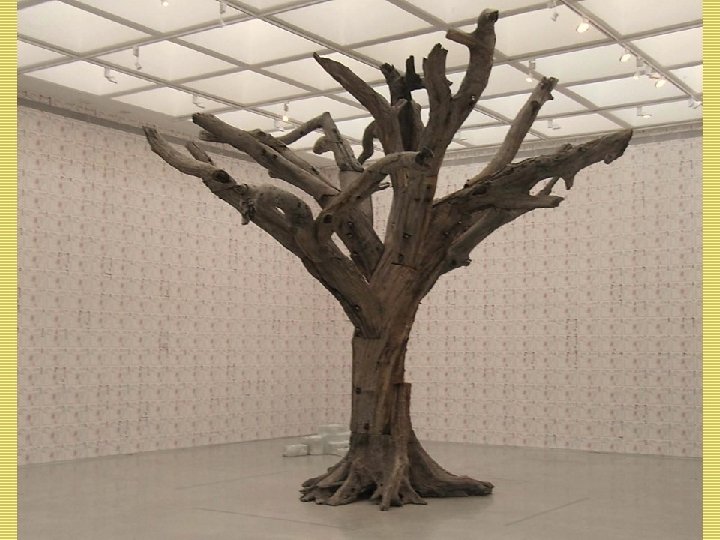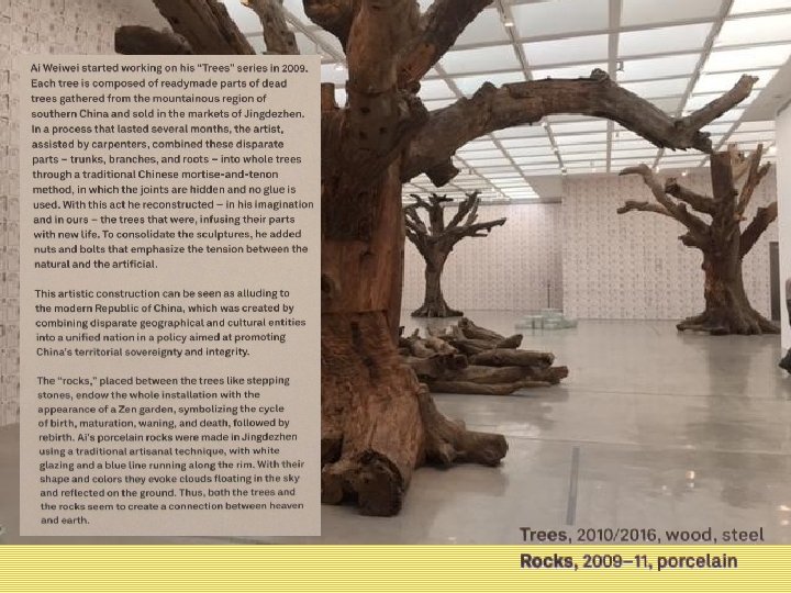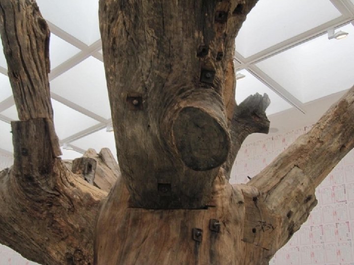 Ai Weiwei Trees Natural objects – from the sunflower seeds that carpeted Tate Modern’s Turbine Hall in 2010 to his series of porcelain rocks and watermelons – have been an ongoing source of inspiration for Ai Weiwei, with trees recurring as a spiritual motif in his work since 2009. These monumental wooden or iron multipartite sculptures are all composites of different parts of different trees gathered by the artist from various parts of China in reference to the ancient Asian tradition of collecting dry fragments of trees for contemplation of their complex forms. Fragments also play an important part in Ai Weiwei’s work as they force attention on foundational elements and the most basic units that combine to create a whole. Here, in line with the artist’s worldview, the whole is not greater than the sum of its parts but rather each individual part is equal and of unique importance. This focus on equality is evidenced in recent projects by the artist that take as their starting point the refugee crisis and challenges to freedom of speech. The iron roots and tree trunks are presented in a natural, untreated state, appearing at first glance as organic forms, yet upon closer inspection, reveal their artificiality. Not born of nature but made by human hands, the works, contorted by the surrounding landscape, represent a society uprooted by industrialisation and modernisation, illustrating how progress can often come at the expense of cultural and societal well-being. By eliminating their original function and value, Ai Weiwei imbues the objects with new