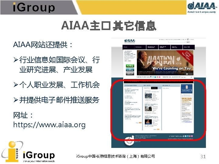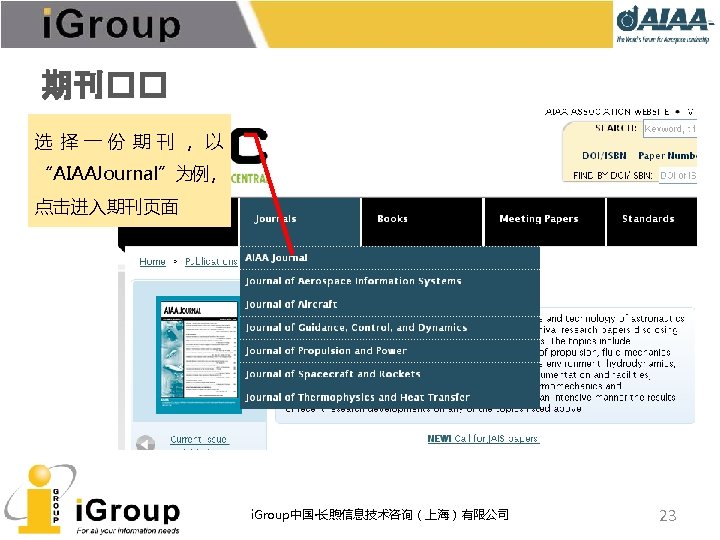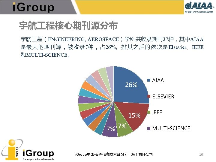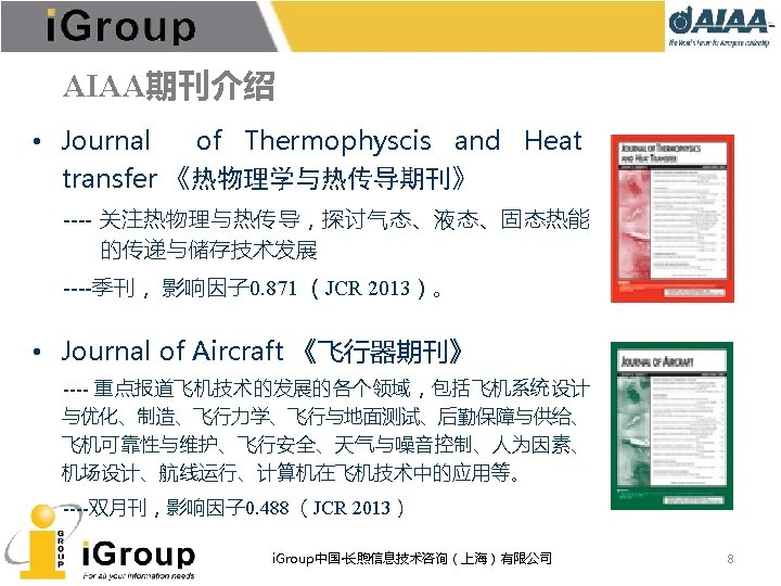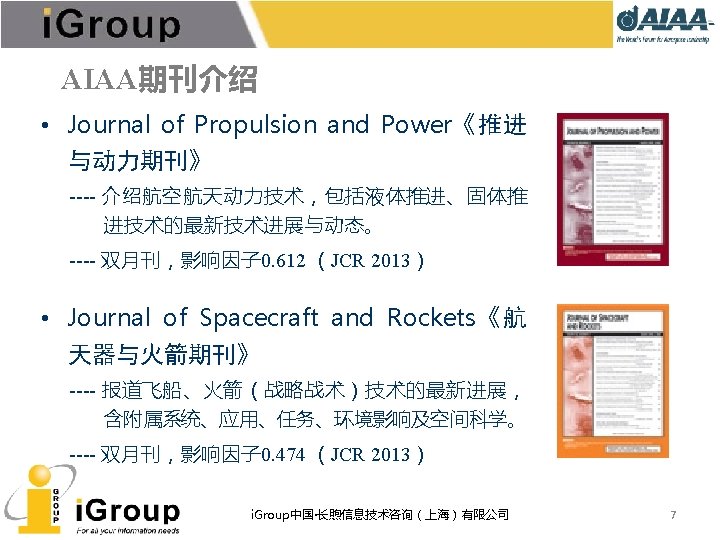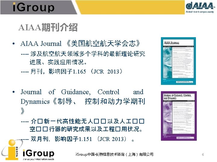 AIAA期刊总览 7种同行�� (peer-reviewed)期刊,全部被JCR收� , 可回溯至 1963年。 • • AIAA Journal of Aircraft Journal of Guidance, Control, and Dynamics Journal of Propulsion and Power Journal of Spacecraft and Rockets Journal of Thermophysics and Heat Transfer Journal of Aerospace Information Systems(原Journal of Aerospace Computing, Information, and Communication) • Journal of Energy(已停刊) • Journal of Hydronautics(已停刊) i. Group中国·长煦信息技术咨询(上海)有限公司 5