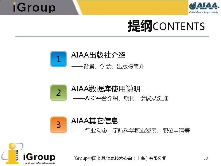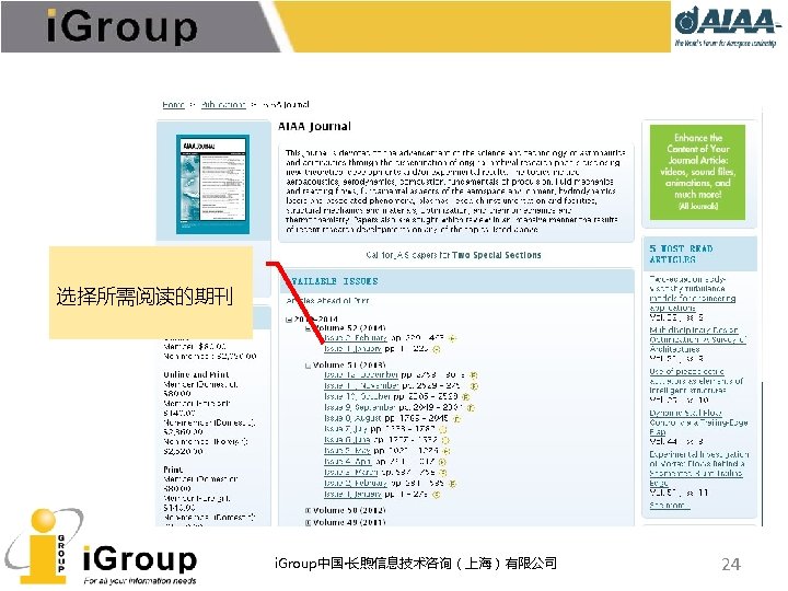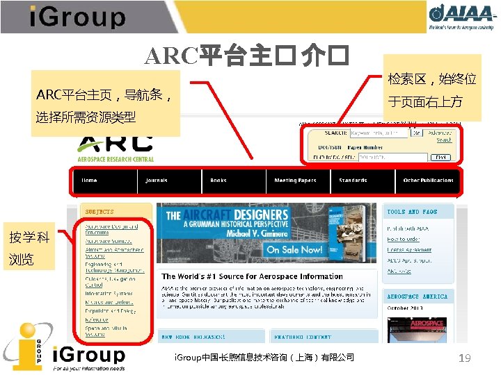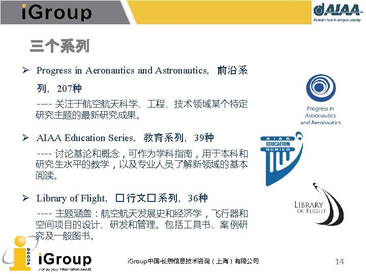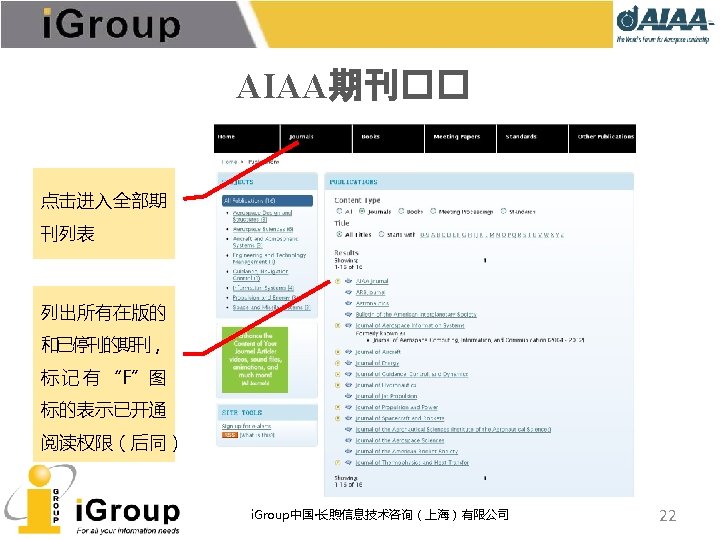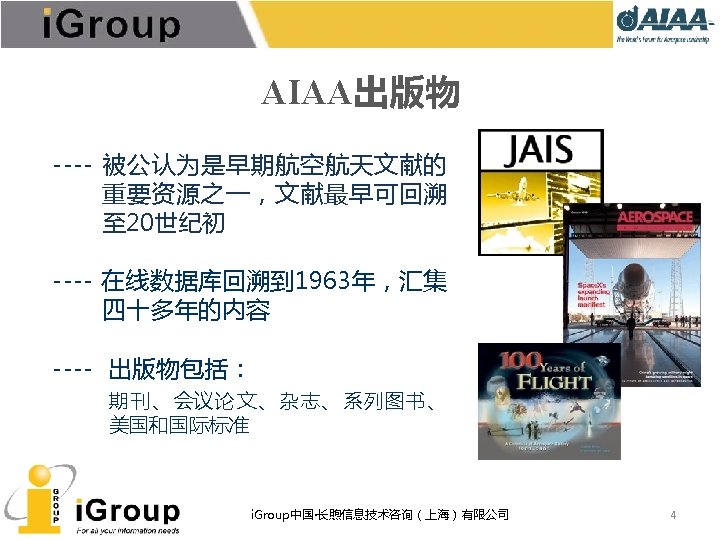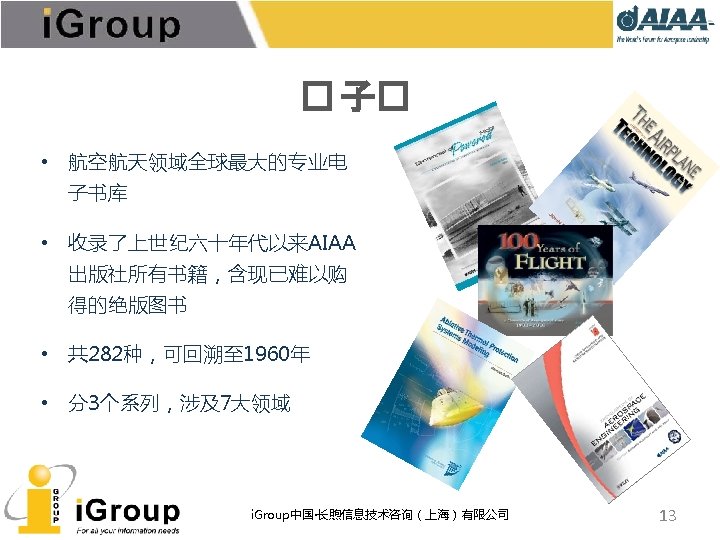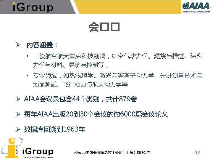 AIAA早期文献 • AIAA的前身:IAS宇航科学学会、ARS/美国火箭学会 • 7种期刊,回溯数据(1930 -1962年) • 与AIAA数据库使用同一平台 期刊名称 收录年限 ARS Journal 1959 -1962 Journal of the Aeronautical Sciences 1934 -1957 Journal of the Aerospace Sciences 1958 -1962 Bulletin of the American Interplanetary Society 1930 -1932 Journal of the American Rocket Society 1954 -1958 Journal of Jet Propulsion 1942 -1960 Astronautics 1933 -1944 i. Group中国·长煦信息技术咨询(上海)有限公司 11