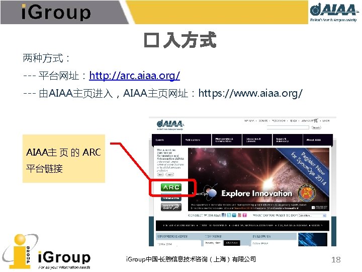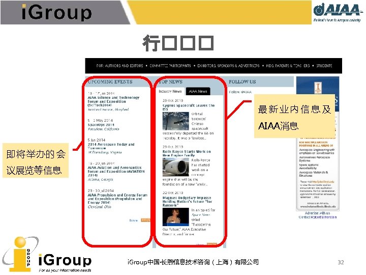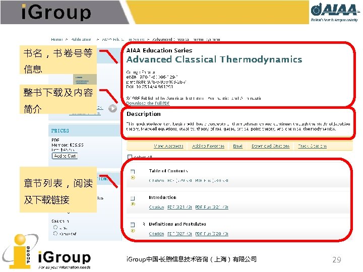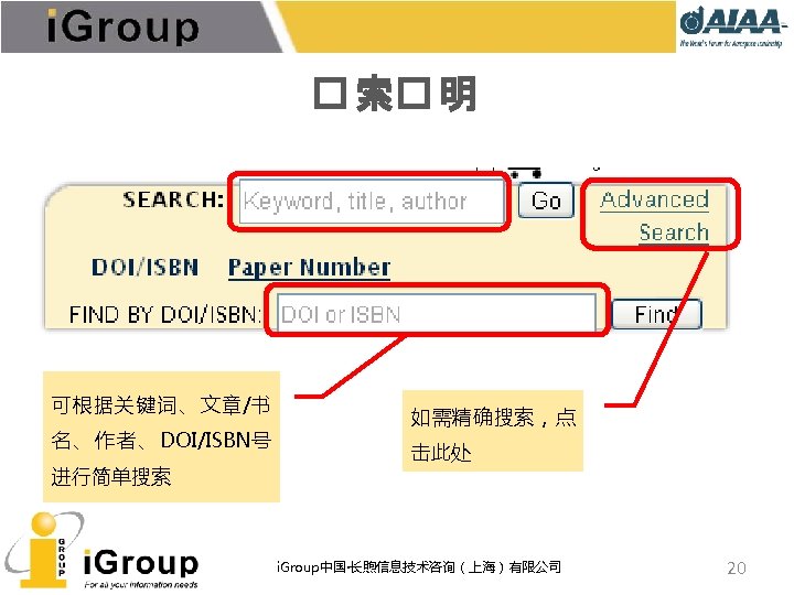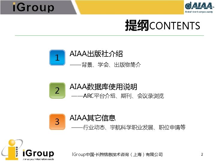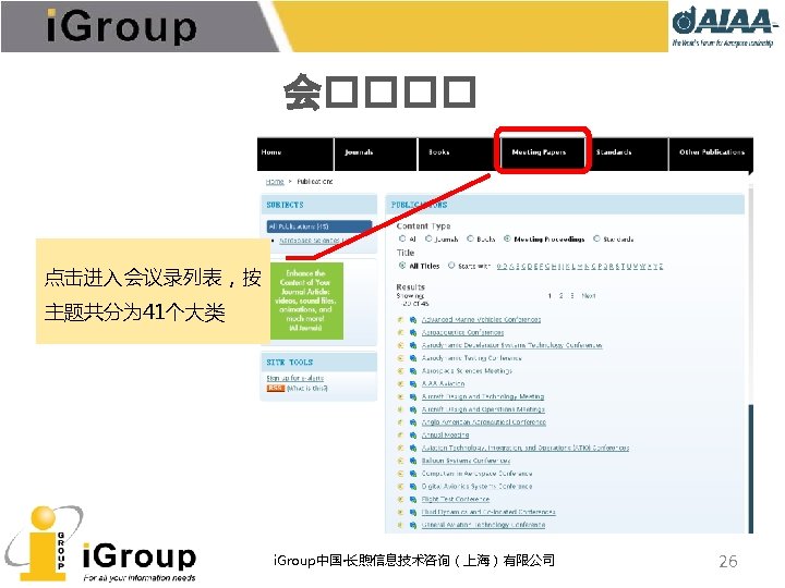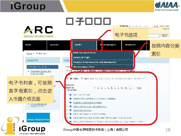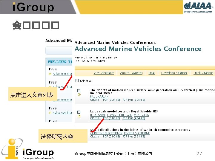 AIAA早期文献 • AIAA的前身:IAS宇航科学学会、ARS/美国火箭学会 • 7种期刊,回溯数据(1930 -1962年) • 与AIAA数据库使用同一平台 期刊名称 收录年限 ARS Journal 1959 -1962 Journal of the Aeronautical Sciences 1934 -1957 Journal of the Aerospace Sciences 1958 -1962 Bulletin of the American Interplanetary Society 1930 -1932 Journal of the American Rocket Society 1954 -1958 Journal of Jet Propulsion 1942 -1960 Astronautics 1933 -1944 i. Group中国·长煦信息技术咨询(上海)有限公司 11