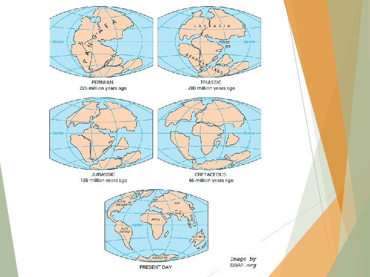 (a) Describe theory of plate tectonics & the evidence supporting theory. In 1912, the geologist Alfred Wegener proposed theory of continental drift. He suggested that many millions of years ago, there was just one land mass, referred to as Pangaea, which slowly separated to form today’s land masses. In the 1960 s, this theory was extensively revised & is now known as theory of plate tectonics. This theory suggests that the outer crust of the Earth, known as the lithosphere, consists of a number of separate plates which ‘float’ on the underlying layer (the asthenosphere). These plates move slowly relative to each other. Where plates move in relation to another, there are three different types of boundaries between them known as convergent, divergent & transform boundaries. Earthquakes, mountain building, volcanic activity & the formation of ocean trenches all occur along these plate boundaries. Evidence supporting theory of plate tectonics includes fit between coastlines (for example the east coast of South America and the west coast of Africa); palaeontology showing the distribution of fossil species; magnetic stripes in the ocean floor. The pattern of magnetic stripes provides clear evidence of ocean floor spreading.