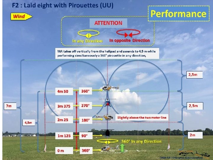 F 2: Laid eight with pirouettes (UU) K=1. 5 MA décolle verticalement de l'héliport et monte à 4, 5 m tout en effectuant simultanément une pirouette à 360 ° dans n'importe quelle direction, puis y plane pendant au moins deux secondes. MA vole en arrière et descend en décrivant un cercle vertical avec un rayon de 2, 5 m tout en effectuant simultanément une pirouette à 360° dans n'importe quelle direction. MA vole vers l'avant et descend en décrivant un cercle vertical avec un rayon de 2, 5 m tout en effectuant simultanément une pirouette à 360° dans la direction opposée, s'arrête et plane pendant au moins deux secondes sur l'héliport. MA descend et atterrit dans l'héliport tout en effectuant simultanément une pirouette à 360° dans n'importe quelle direction. Remarque: Le changement de direction des pirouettes doit se faire en douceur sur la ligne médiane. .