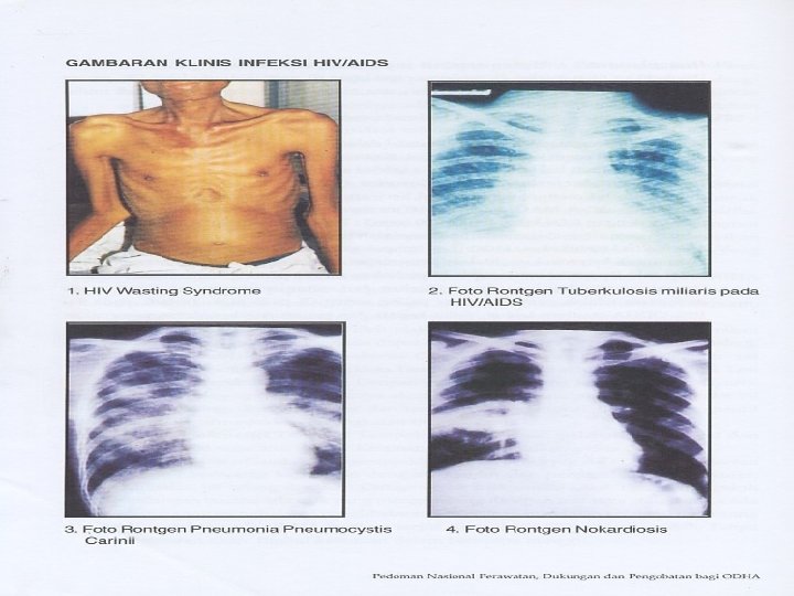 Tanda dan gejala § § § § Rasa leleh berkepanjangan Sesak nafas dan batuk berkepanjangan Berat badan turun secara menyolok Pembesaran kelenjar ( di leher, ketiak, lipatan paha ) tanpa sebab yang jelas Bercak merah kebiruan pada kulit ( kanker kulit ) Sering demam ( lebih dari 38 0 C ) disertai keringat malam Diare lebih satu bulan tanpa sebab yang jelas