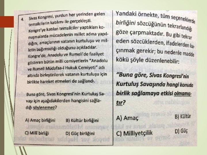 3. Madde kökünde sadece problemi açık ve anlaşılır hale getirecek bir materyal (yazılı, görsel ya da her ikisi birden) kullanılmalıdır. Madde kökünde verilen uzun sözel anlatım içeren, öğretim hedefleriyle uyuşmayan ve problemin anlaşılırlığına hizmet etmeyen metin ya da görsel materyal kullanımı, testin etkililiğini ve etkinliğini olumsuz etkiler. Materyale özgü becerilerin karışmasına yol açacağı için testin geçerliğine zarar verir.