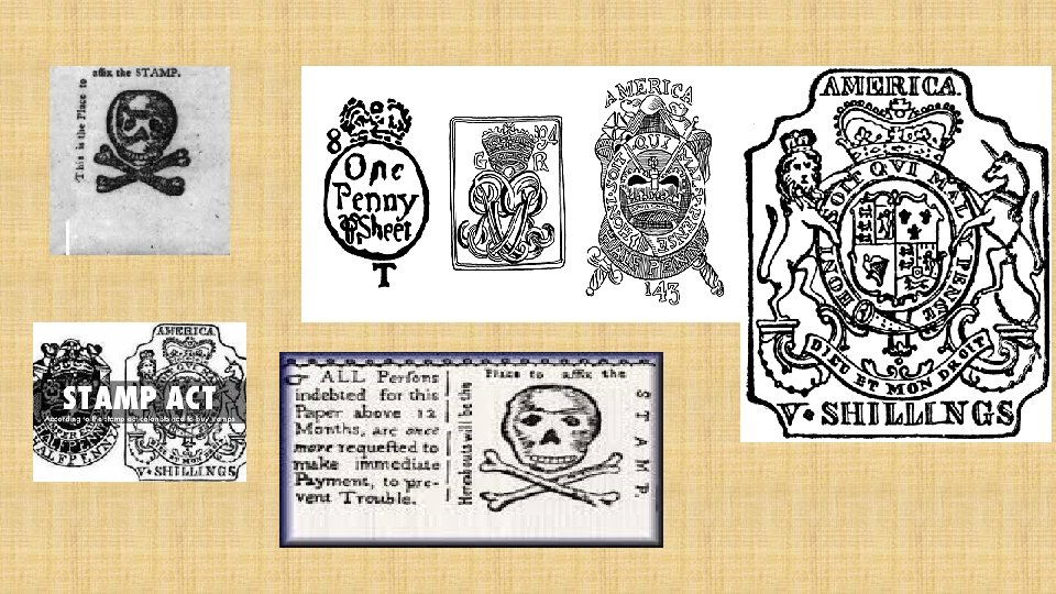 d. (1764) The Stamp Act 1. stamped paper or affixing of stamps to certify payment of taxes (required on bill of sale, playing cards, pamphlets, newspapers, diplomas, marriage certificates) 2. British view of law • Reasonable request: colonists should pay their fair share of debt • British citizens had already been paying stamp tax for years e. “no taxation without representation” became rallying cry (James Otis)