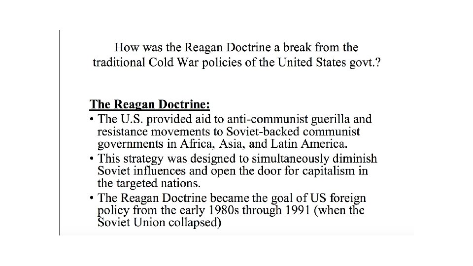 Invasion of Grenada (September, 1983) • 1983 Communist coup stranded 800 U. S. medical students. • Cuba’s role and students’ safety concerned Reagan. • Reagan sent in soldiers who took the island in two days with a loss of 19 soldiers. • The invasion resulted in the appointment of an interim government, followed by democratic elections in 1984.