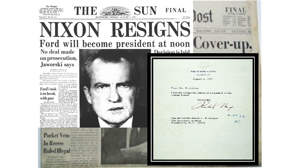 The Watergate Scandal • The Watergate scandal began to unravel in 1973: US v. Nixon Supreme Court case • The discovery that Nixon recorded conversations proved most damning • Recordings in the Oval Office called the “White House Tapes” • The Supreme Court ordered Nixon to turn over all tapes to a Senate investigative committee • …Nixon REFUSES! • The House brought 2 articles of IMPEACHMENT against president • How does Nixon react?
