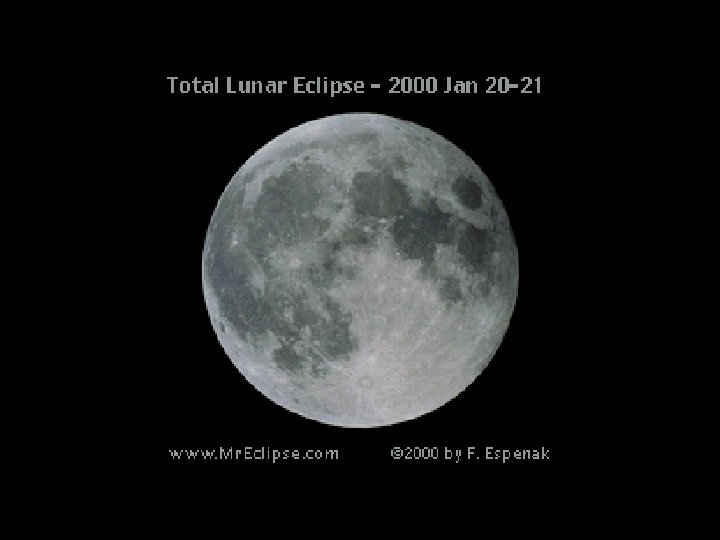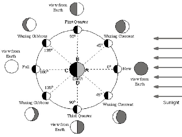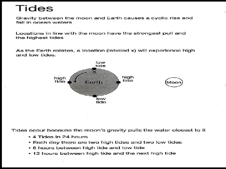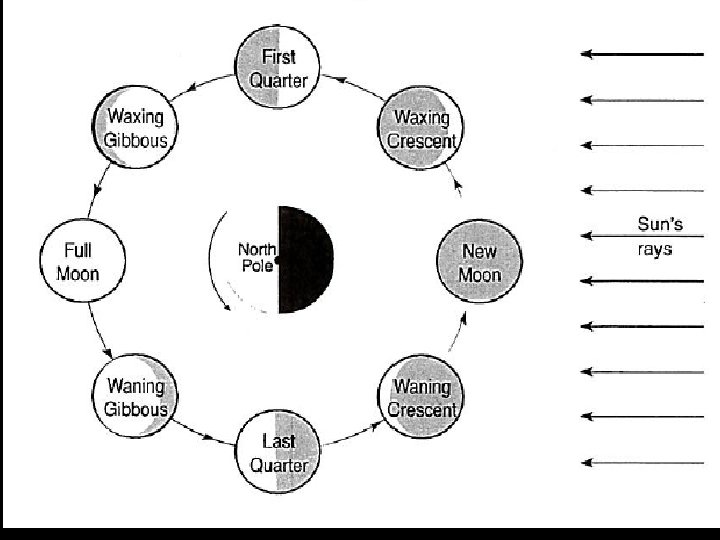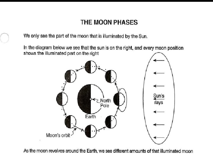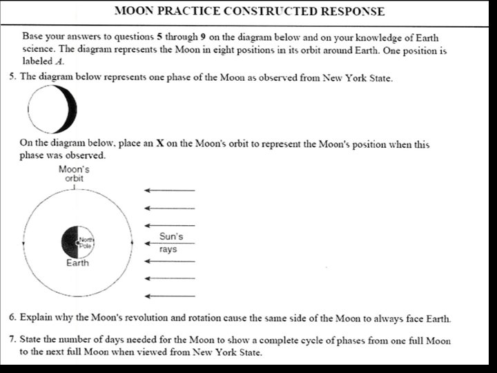 IMPORTANT REGENTS QUESTION: WHY DO WE ALWAYS SEE THE SAME SIDE OF THE MOON ? ANSWER: • The Moon’s period of rotation equals its period of revolution • For every 90 o it rotates, it revolves 90 o.