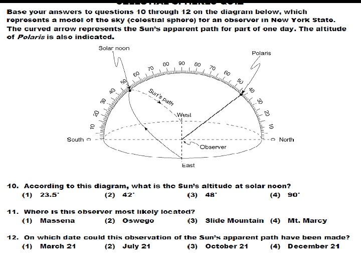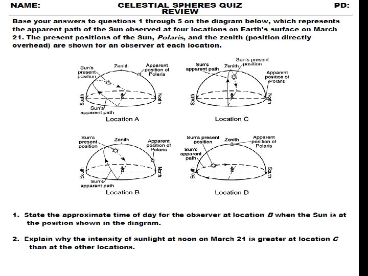 AIM: REVIEW OF CELESTIAL SPHERES DO NOW: 1. TAKE OUT YOUR CELESTIAL SPHERES/SEASONS HW PAGES 12 -22 HW: 1. LAB # 15 DUE TUESDAY 2. CELESTIAL SPHERES AND SEASONS WIZARD DUE TUESDAY 4. Review due Monday 12/2