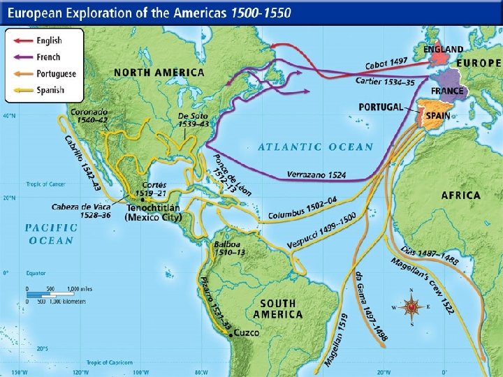 III The Conquest of the Aztecs and the Inca Cortes vs. the Aztecs A) In 1519, from Cuba Cortes led 600 men, 11 ships, 16 horses, and an Aztec translator to Mexico. He burned his ships so his men could not turn back! B) Cortes made alliances with the enemies of Aztec emperor Montezuma. Pizarro vs. the Inca A) Pizarro arrived in Cuzco (the Incan capital) with 200 soldiers and horses. B) The Incan emperor Atahualpa had just won the throne from his brother in a civil war in 1532. Pizarro made an alliance with his brother. C) Pizarro invited Atahualpa for a feast. Atahualpa consented to attend the feast with only 5, 000 unarmed men.