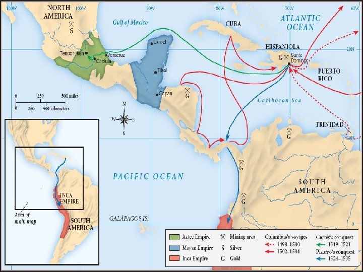 The Conquest of the Aztecs and the Inca Continued… Cortes vs. the Aztecs D) On November 8, 1519, the Spaniards were allowed to enter Tenochtitlan, possibly because the Aztecs believed them to be gods. Once in the city, Cortes took Montezuma hostage. E) In 1520 after a Spanish massacre of the Aztecs, the Aztec rebelled and Montezuma II was killed in the fighting. According to the Aztecs, he was murdered by the Spanish. According to the Spanish, he was murdered by an angry Aztec mob. In May 1521, Tenochtitlan fell to the Spanish after a 3 month siege. Pizarro vs. the Inca D) Pizarro asked Atahualpa to convert to Christianity and accept Charles V as his King. Atahualpa refused. Pizarro commanded the slaughter of 5, 000 Incans. E) Pizarro kept Atahualpa alive, demanding a ransom of a room filled with gold and silver (22 feet long, 17 feet wide, and 8 feet long). Atahualpa did this, but he was executed anyways on August 29, 1533.