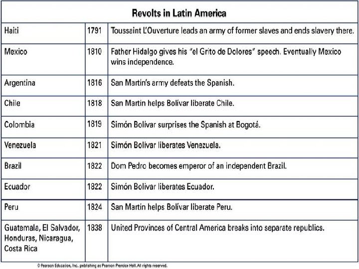 II The Revolutions A) In Mexico the Indians & mestizos played the leading role. In 1810, a poor but well educated Catholic priest, Miguel Hidalgo, called for a revolution against Spain. Hidalgo led an army of 80, 000 Indian & mestizos against the Spanish military & creoles who feared losing their wealth. Hidalgo was killed but Mexicans found new leaders to continue the fight another 10 years. The turning point in the war came in 1820 when the creoles switched sides & joined the revolt against Spain. In 1821, Spain granted Mexico its independence. B) 1811 - 1824, Venezuelan creole Simon Bolivar led an army of revolutionaries against Spain. Bolivar wanted to create a single unified nation of Grand Colombia under a federal constitution modeled after the US. The plan failed because of the differences of the Latin American peoples. Political disputes the new independent colonies became divided into Bolivia, Colombia, Panamá, & Ecuador. C) Argentinean creole Jose San Martín led the independence movement in southern South America new nations of Argentina, Chile & Peru.