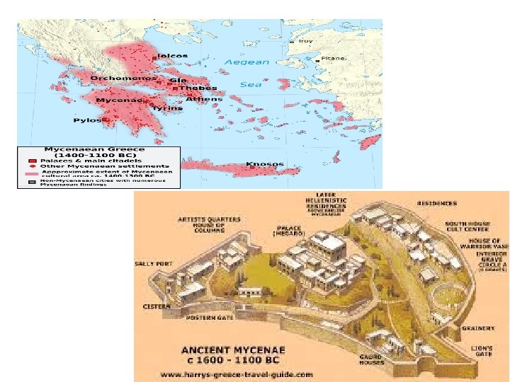 Mycenaean • • First Greek speaking people on mainland 2000 BC—settled in southern Greece Lived in separate city states Palace in center on a hill Sea traders Ruled by warrior-kings Invaded Minoans