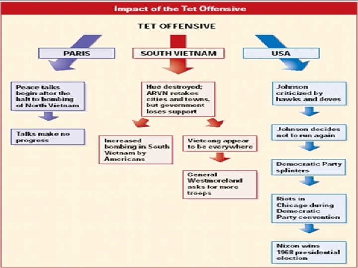 Tet Offensive (1968) The Vietcong and North Vietnamese launched several attacks on every big city in South Vietnam, and broke into the U. S. embassy in Saigon, the South Vietnamese capital. • While the U. S. was able to strike back and actually declare a military victory here, many Americans witnessed the graphic images on the TV news that shocked and sickened them. • The Tet Offensive marked the TURNING POINT OF THE WAR, showing that even with half a million troops, no part of S. Vietnam was safe and the war was far from over. • North Vietnam sent supplies to the Vietcong in the south through the Ho Chi Minh Trail • Some thought our government was not telling us