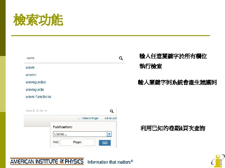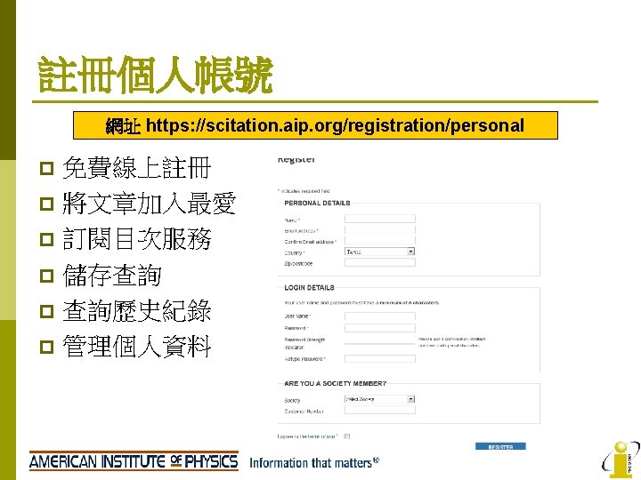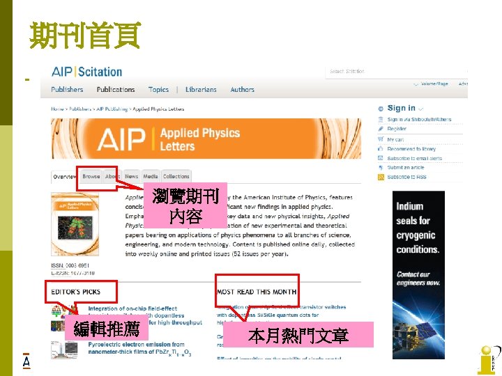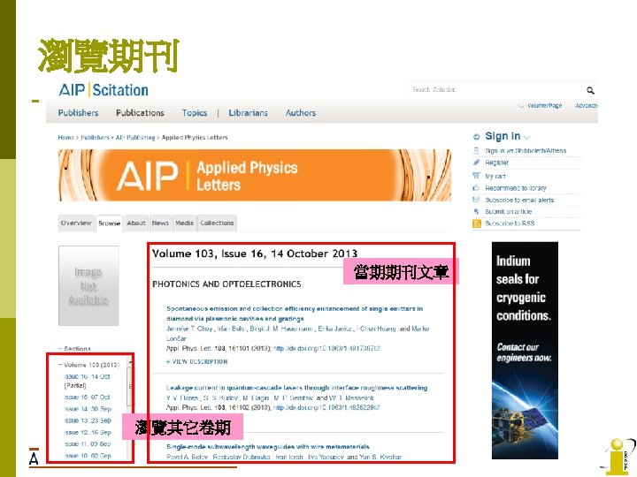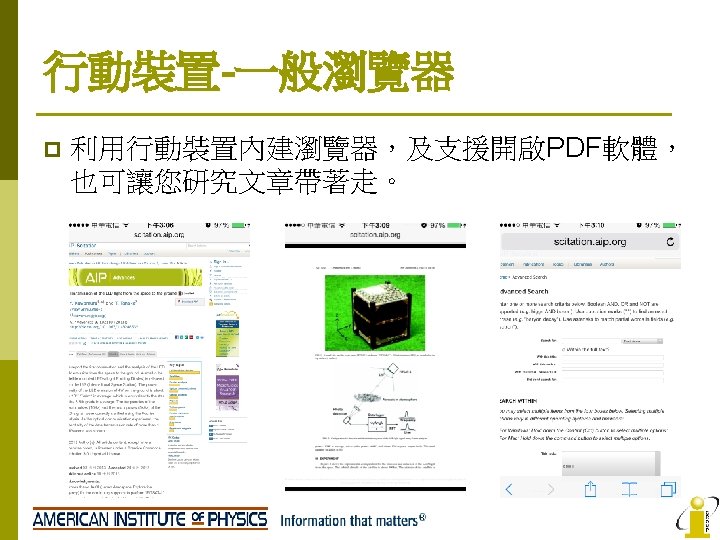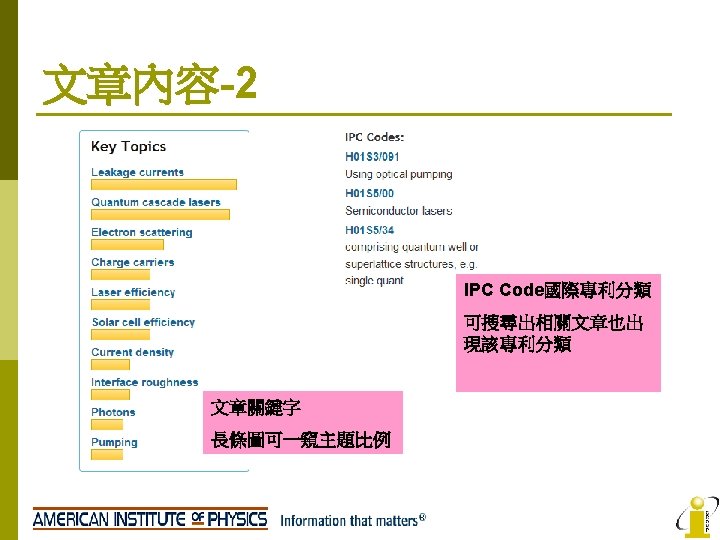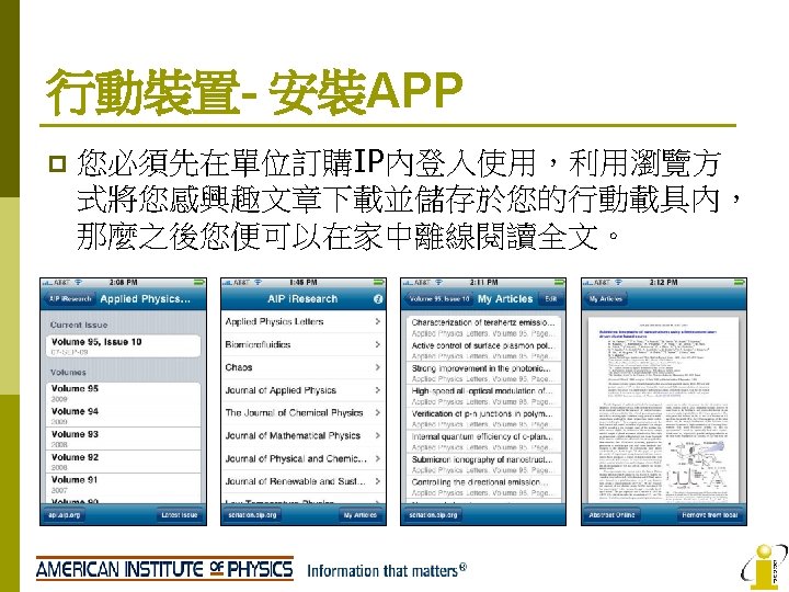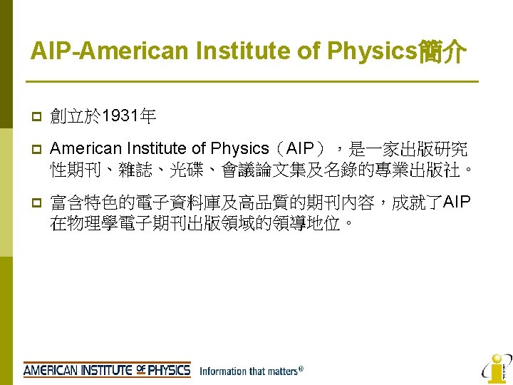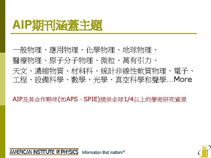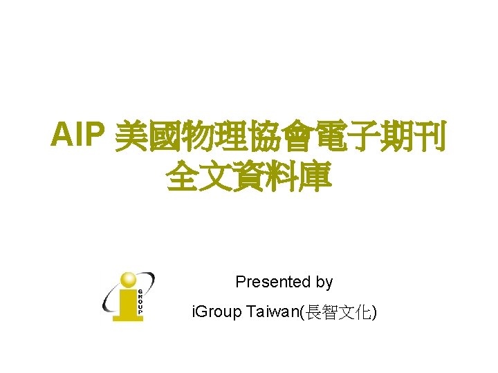 AIP No AIP Titles IF 2008 1 Applied Slides: 22 Download presentation AIP收錄期刊清單 No AIP Titles 起始年代 IF 2008 1 Applied Physics Letters 1999 -present 3. 726 2 Chaos 1999 -present 2. 152 3 Journal of Applied Physics 1999 -present 4 Journal of Chemical Physics 5 Journal of Mathematical Physics 6 Journal of Physical and Chemical Reference Data 9/175 PHYSICS, MATHEMATICAL 2. 171 17/94 PHYSICS, APPLIED 1999 -present 3. 149 5/31 1999 -present 1. 085 28/46 1999 -present 2. 424 1997 -present 0. 78 8 Physics of Fluids 1999 -present 1. 738 9 Physics of Plasmas 1999 -present 2. 427 10 Review of Scientific Instruments 1999 -present 1. 738 2011 -present n/a Open Access APL Materials PHYSICS, APPLIED MATHEMATICS, APPLIED Low Temperature Physics AIP Advances 5/95 領域 10/46 7 Open Access 排行 2013 n/a PHYSICS, ATOMIC, MOLECULAR & CHEMICAL PHYSICS, MATHEMATICAL 34/127 CHEMISTRY, MULTIDISCIPLINARY 42/113 CHEMISTRY, PHYSICAL 14/68 PHYSICS, MULTIDISCIPLINARY 77/95 PHYSICS, APPLIED 23/112 MECHANICS 14/26 PHYSICS, FLUIDS & PLASMAS 7/26 PHYSICS, FLUIDS & PLASMAS 16/56 INSTRUMENTS & INSTRUMENTATION 36/95 PHYSICS, APPLIED n/a n/a AIP Journals Thanks for you attention! If you have any question, please contact: i. Group Taiwan(長智文化) TEL: 02 -2571 -3369 Email: service@igrouptaiwan. com