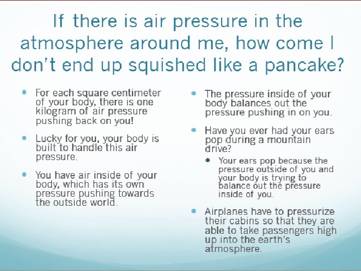 UNDER PRESSURE • Air exerts pressure • How do some objects hold their shape then? Let’s think about the balloon again, the air outside of the balloon is exerting the same amount of pressure that the air inside is. Therefore, allowing the balloon to keep a constant shape. If the pressure was not balanced then the balloon would burst. • Atmospheric Pressure: Earth’s gravity pulling on air towards EARTH. This puts pressure on your body. • Why don’t humans get crushed from atmospheric pressure? We are designed to handle the pressure and WE HAVE AIR INSIDE US to balance the pressure.